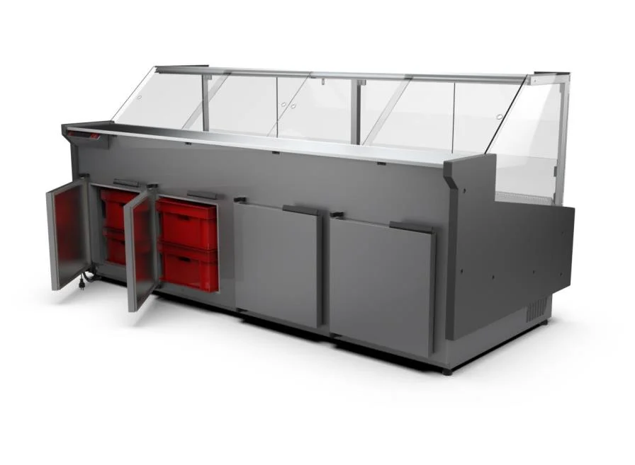 Opcje dodatkowe: oświetlenie LED mięsne,elektryczne grzałki odszraniania parownika, przegroda stała - szkło, przegroda regulowana - plexi, półka od strony klienta profil aluminium, blat granitowy, niestandardowy kolor elementów metalowych.
