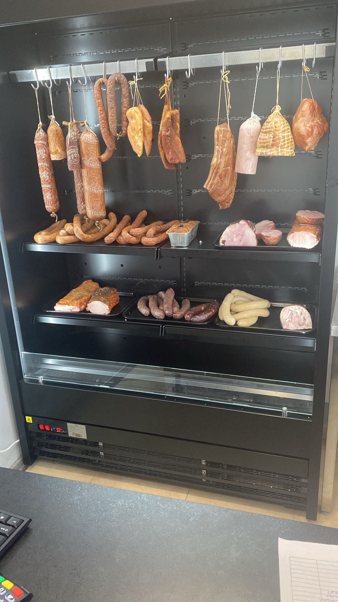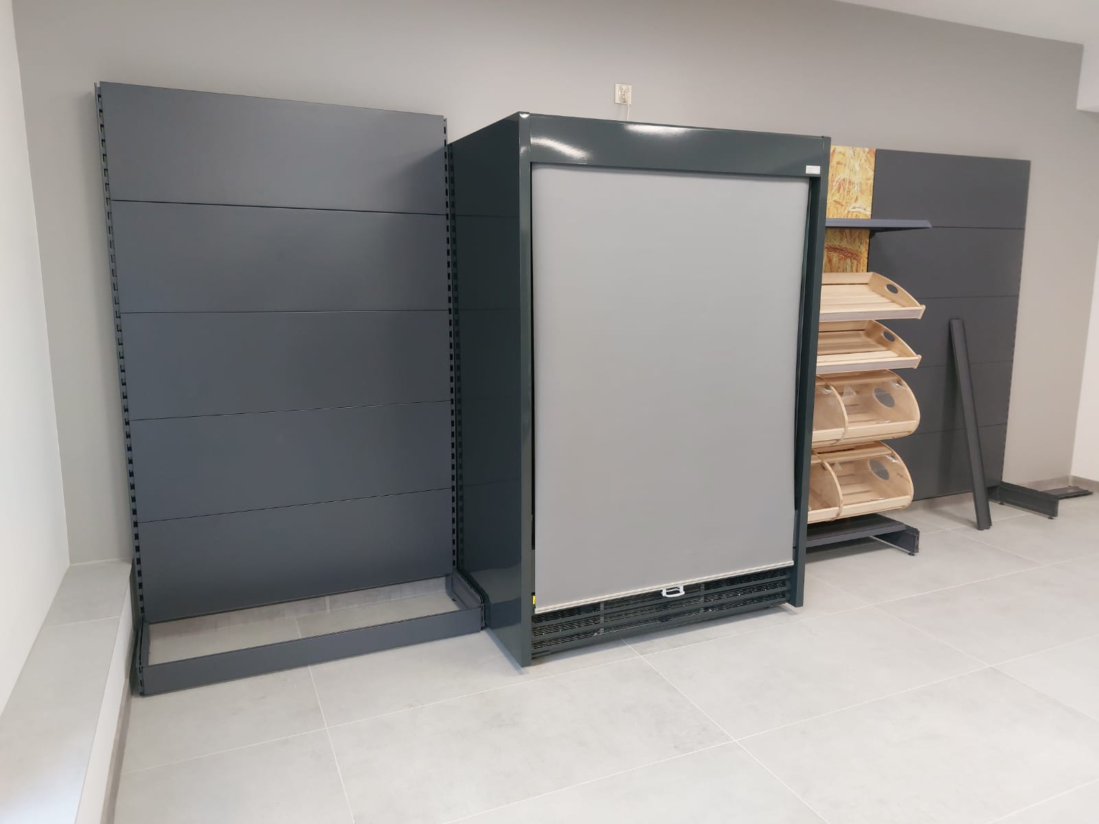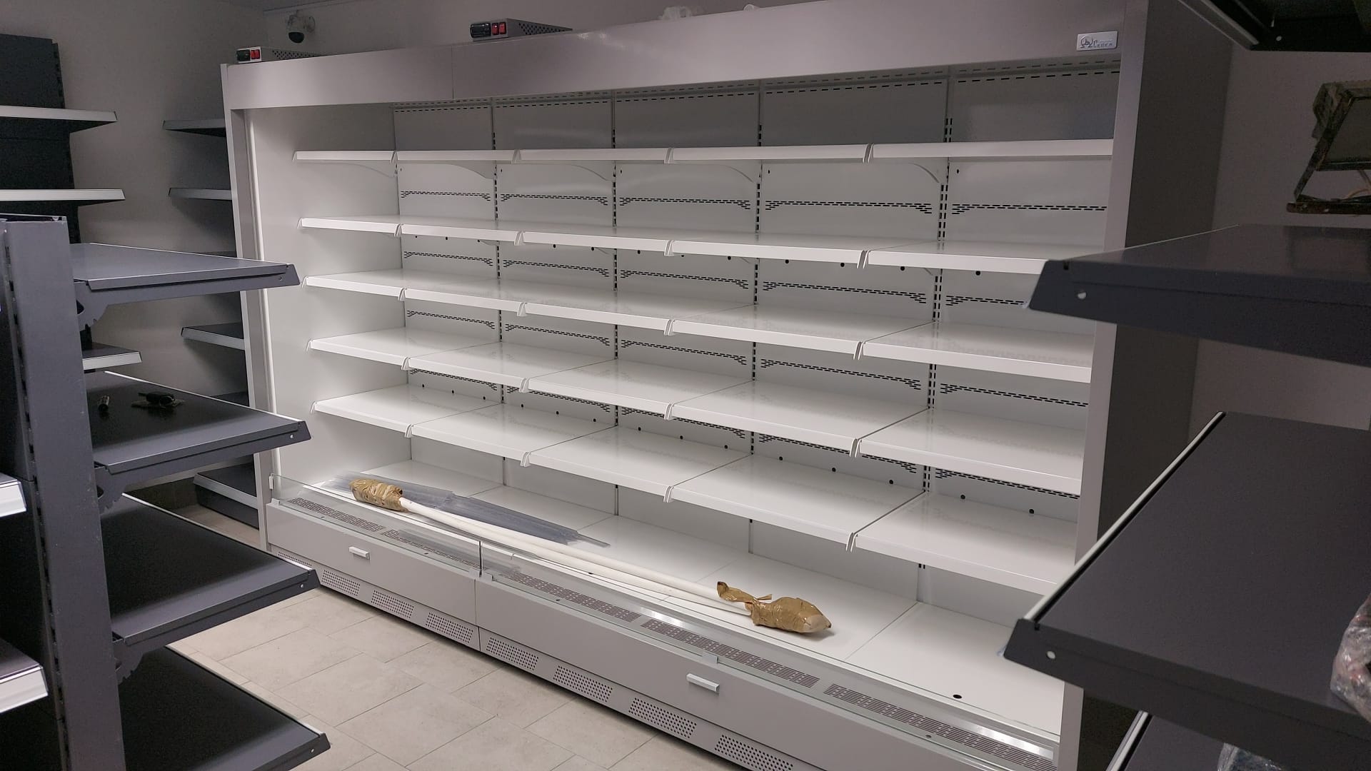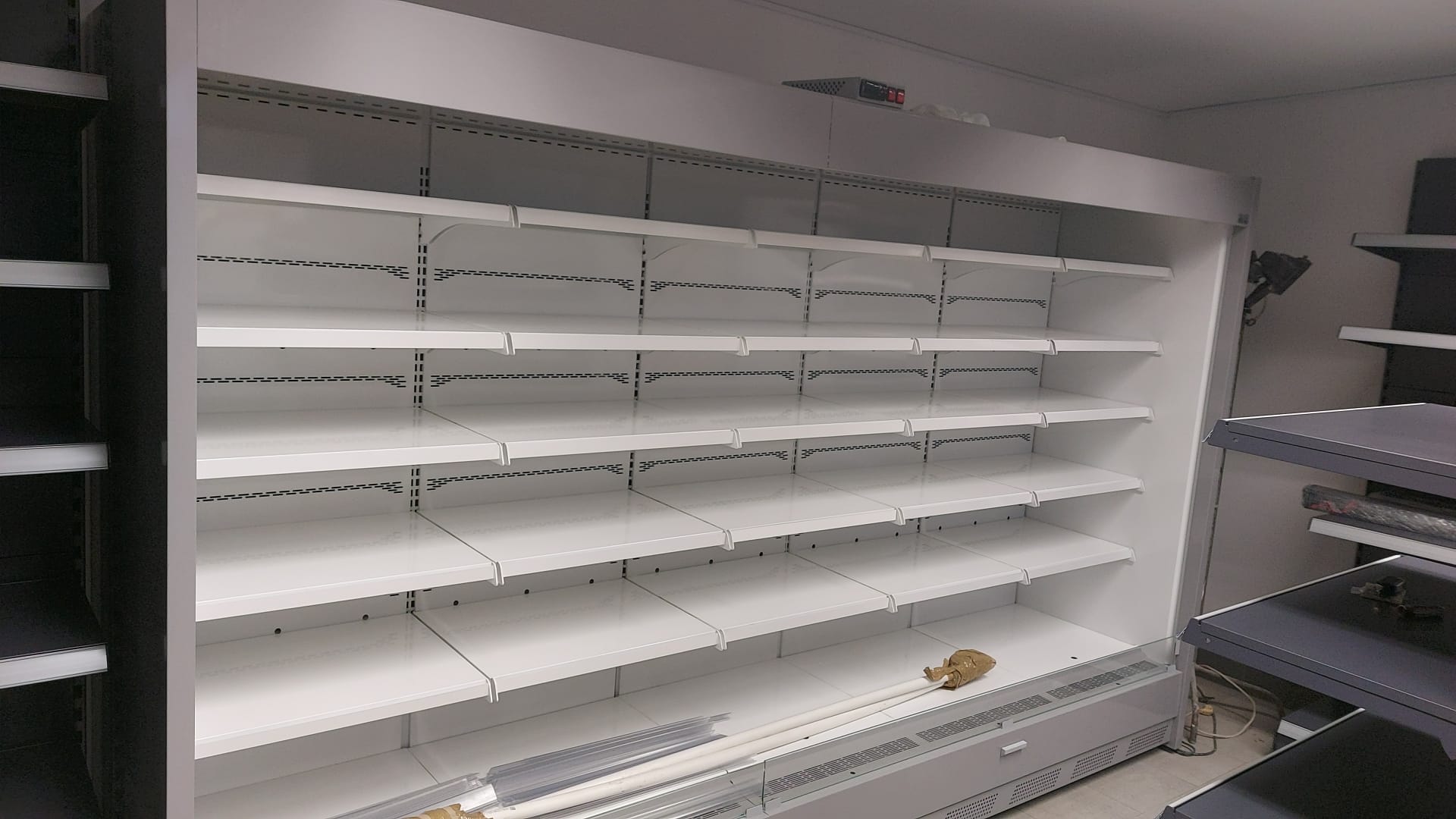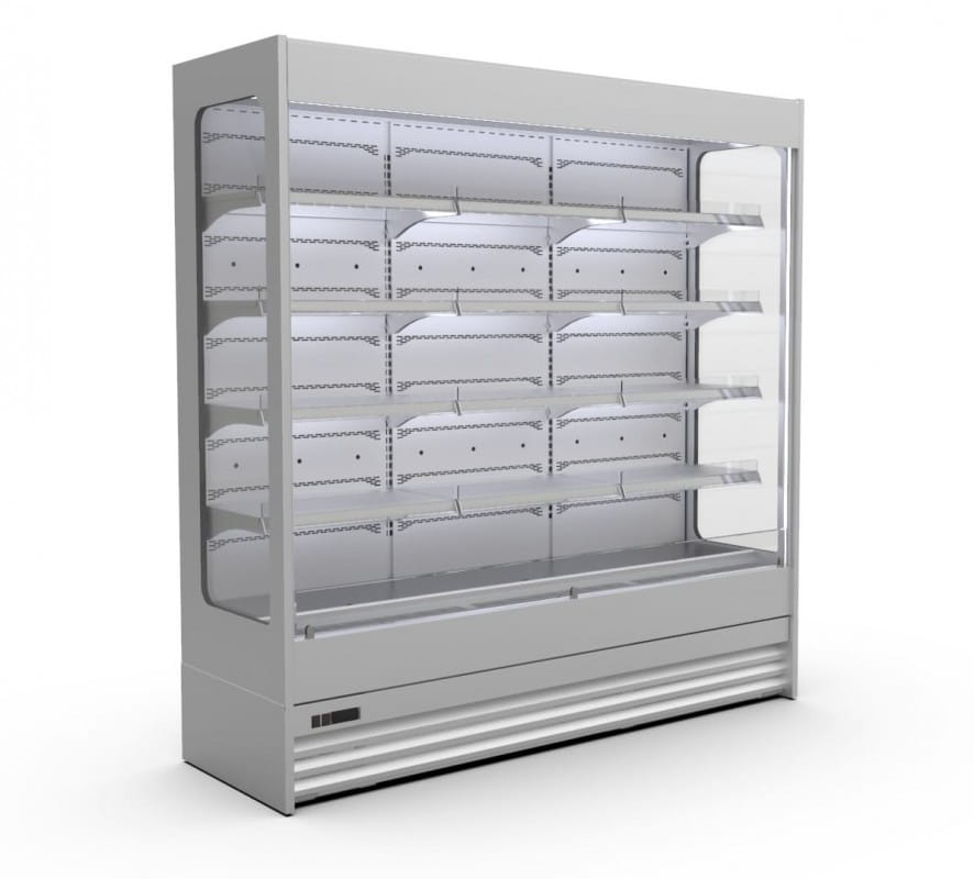 Regał na agregat chłodniczy wewnętrzny otwarty, chłodzenie dynamiczne, boki metalowe pełne i korpus izolowany ekologiczną pianką poliuretanową, 4 rzędy półek z regulowaną wysokością i trzystopniową regulacją pochylenia, wnętrze regału i półki z blachy lakierowanej białej, oświetlenie led pionowe i poziome, listwy cenowe, automatyczne odparowanie skroplin.