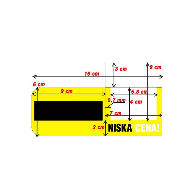 Podzielony jest na dwie części: na jednej jest dwustronny napis "promocja" (ta część wystaje od listwy cenowej) i ma wymiar 90x60mm; druga część (umieszczona na listwie cenowej) ma wymiar 70x60mm, w tym przezroczyste okienko 58x40mm.
